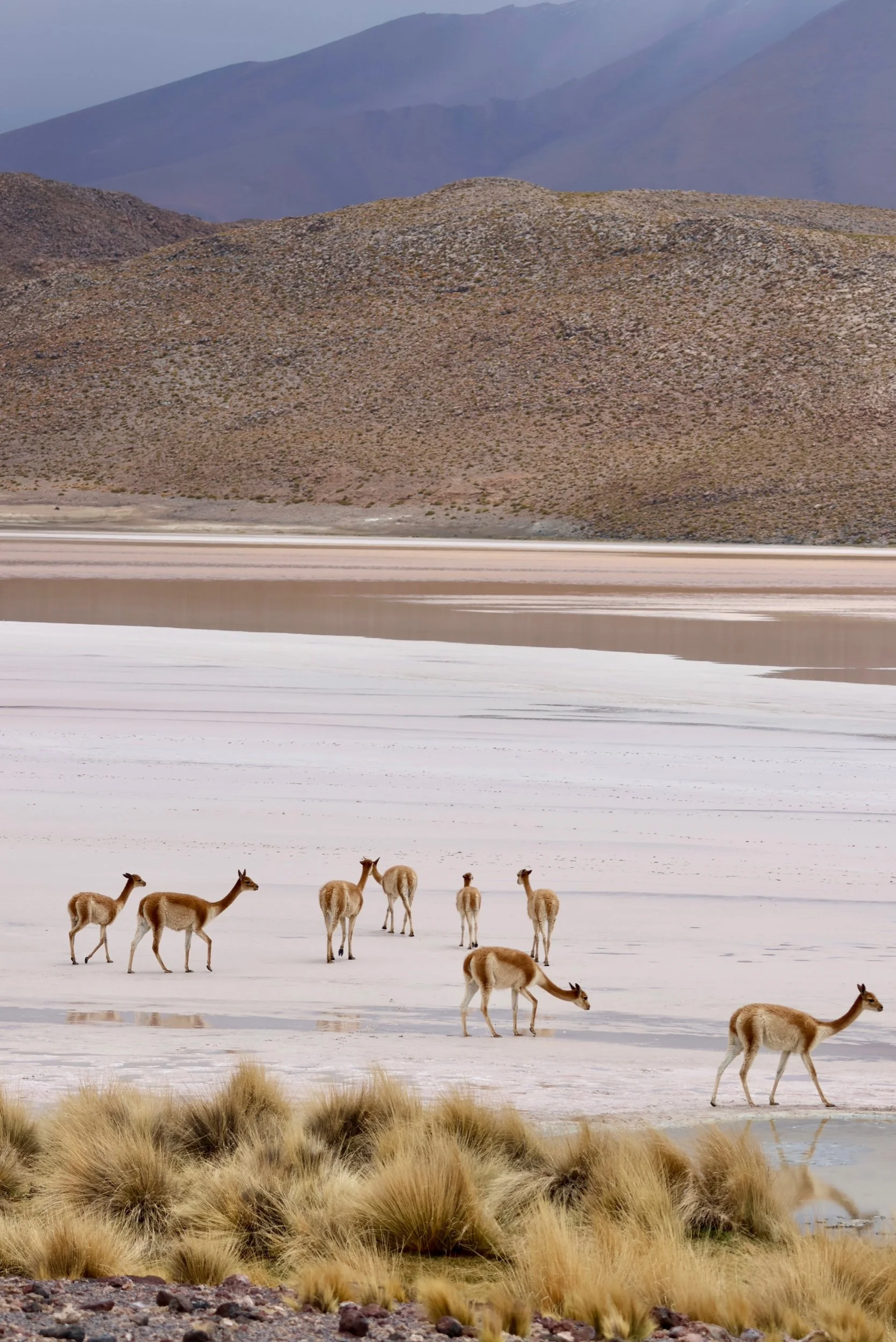 We ended our day in the Eduardo Avoroa National Andean Faune Reservation, a protected area containing lakes, rivers, mountains, volcanos, geysers, hot springs, and plenty of unique wildlife suited to this region. The largest lake is called Laguna Colorado which is home to more flamingoes and has a reddish tint to the water from the mineral runoff from the mountains. There were also some llamas and vicuñas near the shore grazing and drinking.